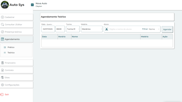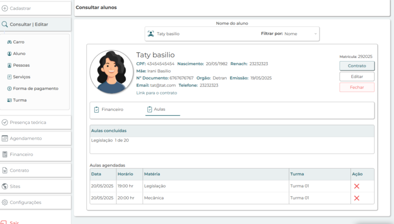 Entre os principais recursos implementados estão o cadastro completo de alunos, agendamento de aulas teóricas e práticas, painel para acompanhamento do progresso, área de controle financeiro e funcionalidades voltadas à rotina dos instrutores. A interface foi pensada para ser clara e objetiva, facilitando o uso tanto para administradores quanto para colaboradores.