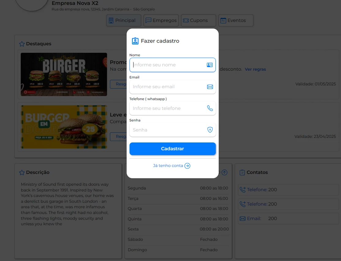 Cada empresa participante conta com um mini site exclusivo dentro da revista, onde pode apresentar sua identidade visual, informações de contato, fotos, catálogo de produtos e links diretos para redes sociais e WhatsApp. Além disso, a plataforma oferece cupons de desconto, que incentivam a compra local e criam um canal de vantagem real para os consumidores.